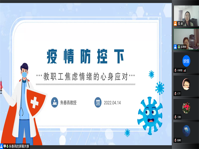 4月14日,校教职工心理健康服务中心邀请永利 副院长朱春燕教授,以“疫情时期的焦虑情绪应对”为主题,为全校职工开展了一场线上公益讲座,提醒广大教职工做好“心理防疫”。全校500余名教职工线上参加活动。